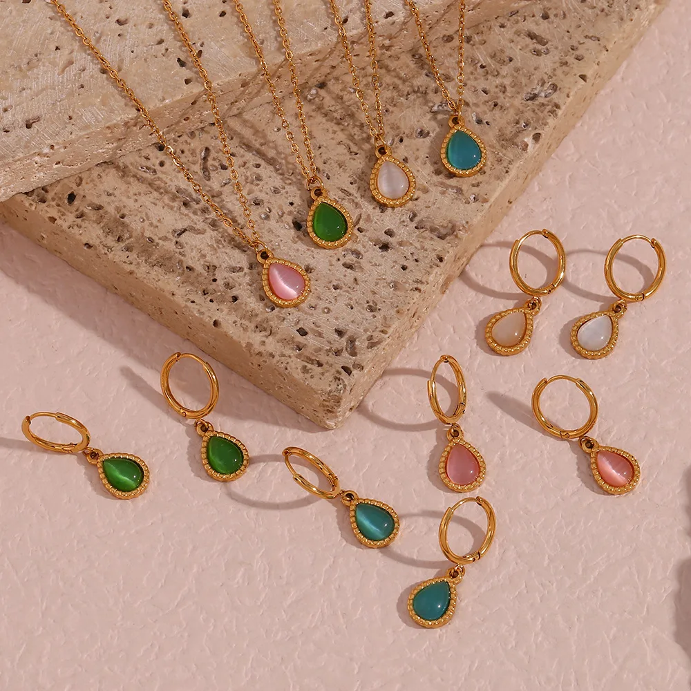 Cat's Eye Stone New Water Droplet Creative Necklace/Earring Set Women's 316L Stainless Steel Waterproof Luxury Gift
