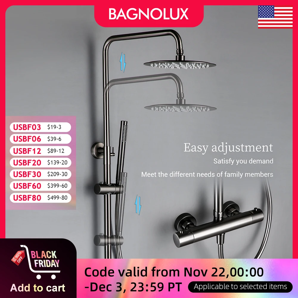 Thermostatic Shower Faucet Rain Head 8 - 16 Inches Gunmetal Bathroom Shower Set Adjustable Height Shower Arm /Rain Sky Support