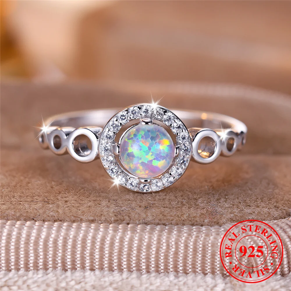 Cute Female Natural White Fire Opal Stone Round Ring Real 925 Sterling Silver Wedding Jewelry For Women